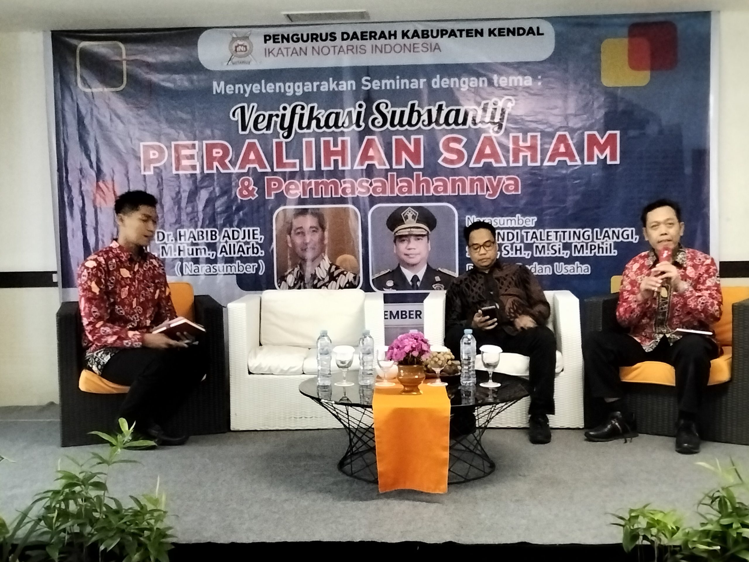 SEMARANG(indonesiapublisher.com)- Pengurus Daerah Kabupaten Kendal Ikatan Notaris Indonesia ( Pengda Kabupaten Kendal INI) dengan bangga menggelar acara Seminar dengan mengusung tema apik dan update yakni “Verifikasi Substantif Peralihan Saham & Permasalahannya” dengan menghadirkan narasumber handal , hebat dan kompeten yaitu Direktur Badan Usaha Dirjen AHU Kementerian Hukum,RI. Dr.Andi Taletting Langi,S.IP,S.H,M.Si,M.Phil dan Dr.Habib Adjie,S.H,M.Hum. bertempat di Harris Hotel Sentraland Jalan Ki Mangun Sarkoro,Semarang Sabtu. 6. Desember 2025.