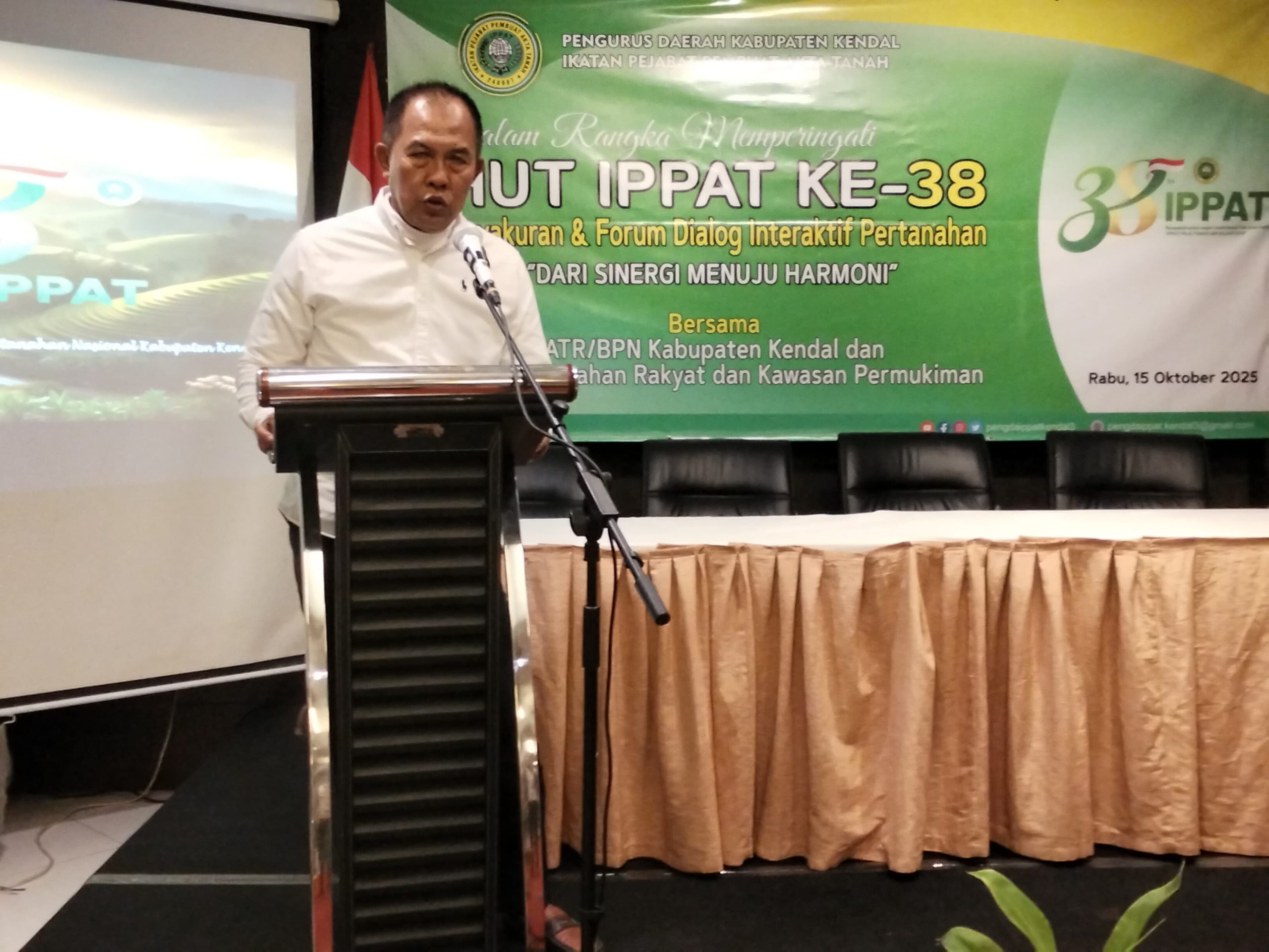 KENDAL(indonesiapublisher.com)- Bertempat di Ballroom Merak  Tirto Arum  Hotel & Resto Kendal, Jawa Tengah pada Rabu (15/10/2025) mulai pukul 08.00 wib hingga selesai, Pengda IPPAT Kabupaten Kendal menggelar acara Tasyakuran HUT IPPAT ke-38 dan Dialog Interaktif Pertanahan