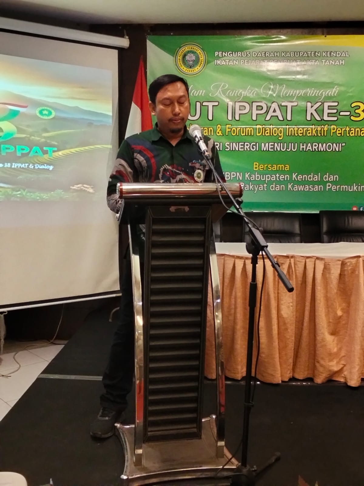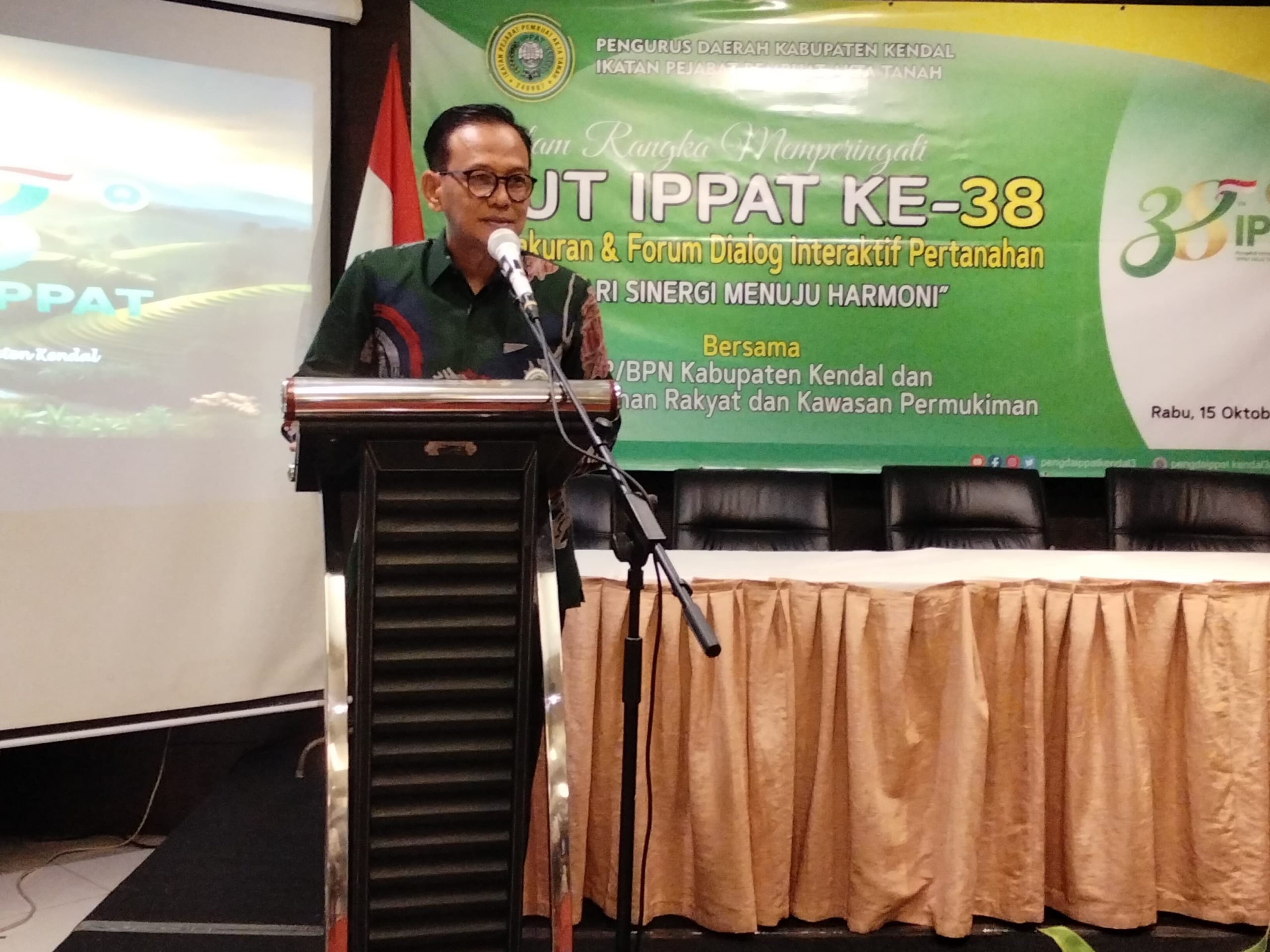 IPPAT ke-38  dan Dialog Interaktif Pertanahan,Aris Sunarno,SH,M.Kn. dalam laporannya menyampaikan,  Alhamdulillah kegiatan acara Tasyakuran HUT IPPAT ke-38 dan Dialog Interaktif PertanahanDengan Tema : “Dari Sinergi Menuju Harmoni, Bersama ATR/BPN dan Dinas Perumahan  Rakyat dan Kawasan Permukiman (Perkim) Kabupaten Kendal