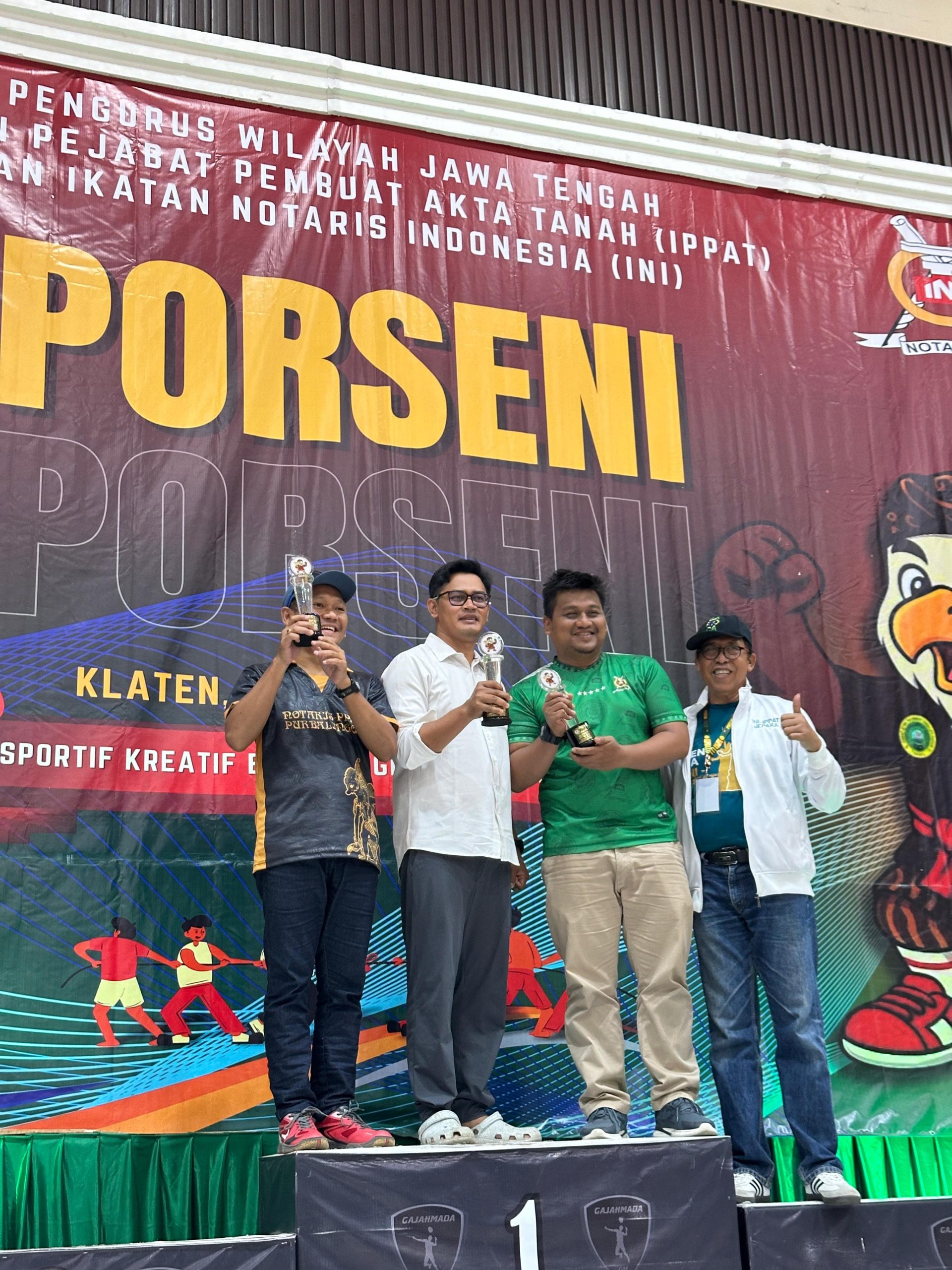 SALATIGA(Indonesia publisher.com)- Pada perhelatan acara  Pekan   Olahraga dan       Seni           (PORSENI)      yang diselenggarakan  oleh  Pengurus  Wilayah Jawa Tengah Ikatan Notaris Indonesia dan Ikatan Pejabat Pembuat Akta Tanah (Pengwil Jateng INI – IPPAT) bertempat di Gedung Olehraga ( GOR) Gelarsena, Klaten pada 19 – 20 September 2025, tim tarik tambang putra dari Pengda INI – IPPAT Kota Salatiga berhasil meraih juara  I serta juara rias dan kostum terbaik lomba tari kreasi.